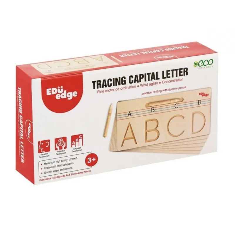 Tracing on engraved alphabet with dummy pencil is great fun and fantastic way to learn writing. It helps develop finger grip, wrist agility and hand-eye co-ordination.